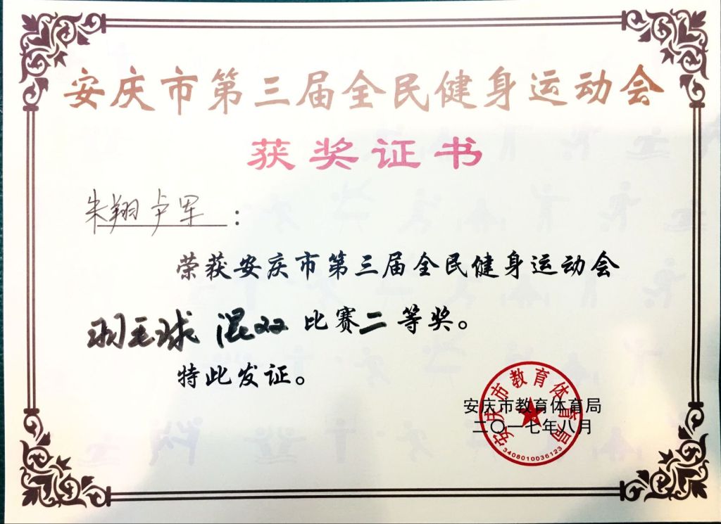 安慶市第三屆全民健身運動會于8月8日正式舉行。安慶分公司朱翔同志代表安徽省工業設備安裝有限公司參加羽毛球項目的比賽,獲得了男子團體三等獎和混雙二等獎的好成績。