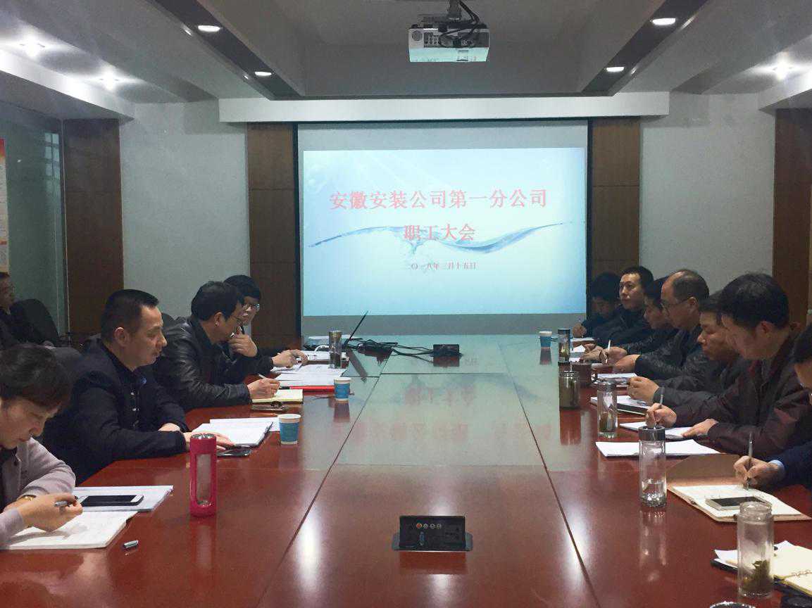 2018年3月15日,第一分公司在分公司機關召開2017年度職工大會。公司黨委書記、副總經理胡六中,紀委書記、工會主席李寬旭,人力資源部經理王敏等出席了會議,分公司機關全體人員及在肥項目部員工共36人參加了會議。會議由第一分公司黨支部書記胡迎東主持。