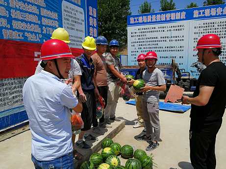 6月18日一大早,項目負責人攜管理人員,帶著粽子、西瓜、白糖等慰問品,為奮斗在一線的工人帶去一份份節日的問候和祝福,并叮囑大家規范操作,遠離三違,安全生產。