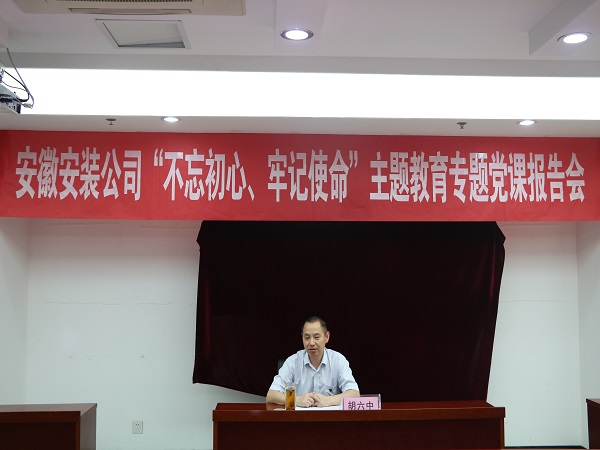 根據安徽安裝公司黨委“不忘初心、牢記使命”主題教育工作部署安排,8月8日下午,安徽安裝公司召開“不忘初心、牢記使命”主題教育專題黨課報告會,集團主題教育第一指導組應邀出席報告會。