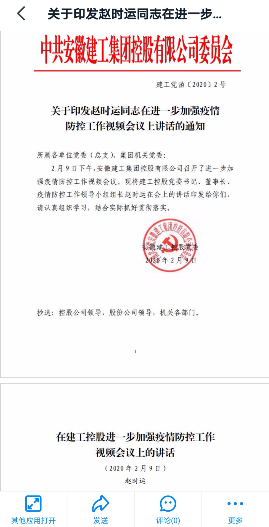 2月11日,安徽安裝公司通過釘釘日志、疫情防控群等網(wǎng)絡形式,迅速將《集團公司黨委書記、董事長趙時運在進一步加強疫情防控工作視頻會議上的講話》精神,傳達到每名職工,做到人人皆知,認真加以貫徹落實。