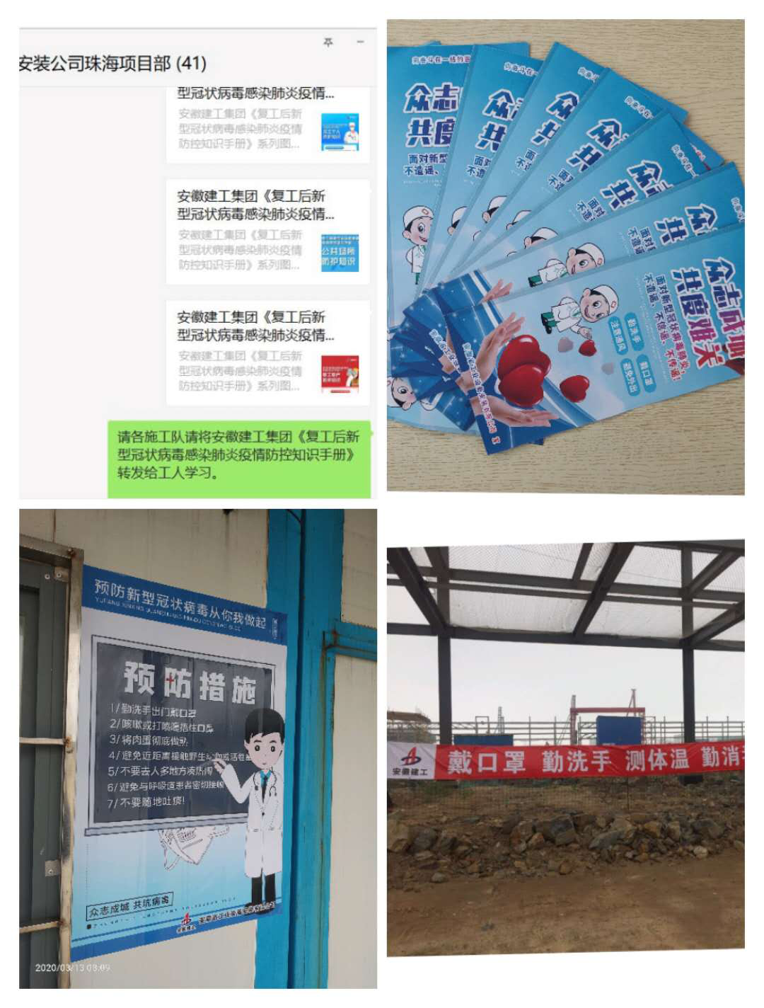 做好疫情宣傳,做好疫情指導(dǎo)。項(xiàng)目部通過(guò)微信群、印制宣傳手冊(cè)、懸掛條幅等提高防控意識(shí),形成全員重視自身防護(hù)的良好氛圍。