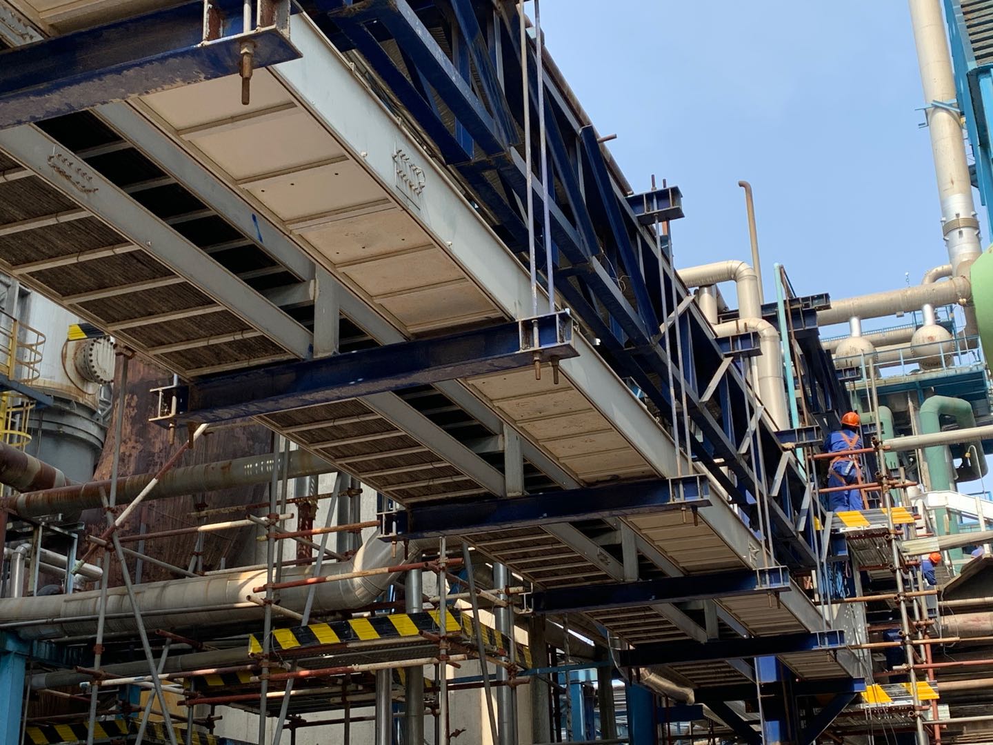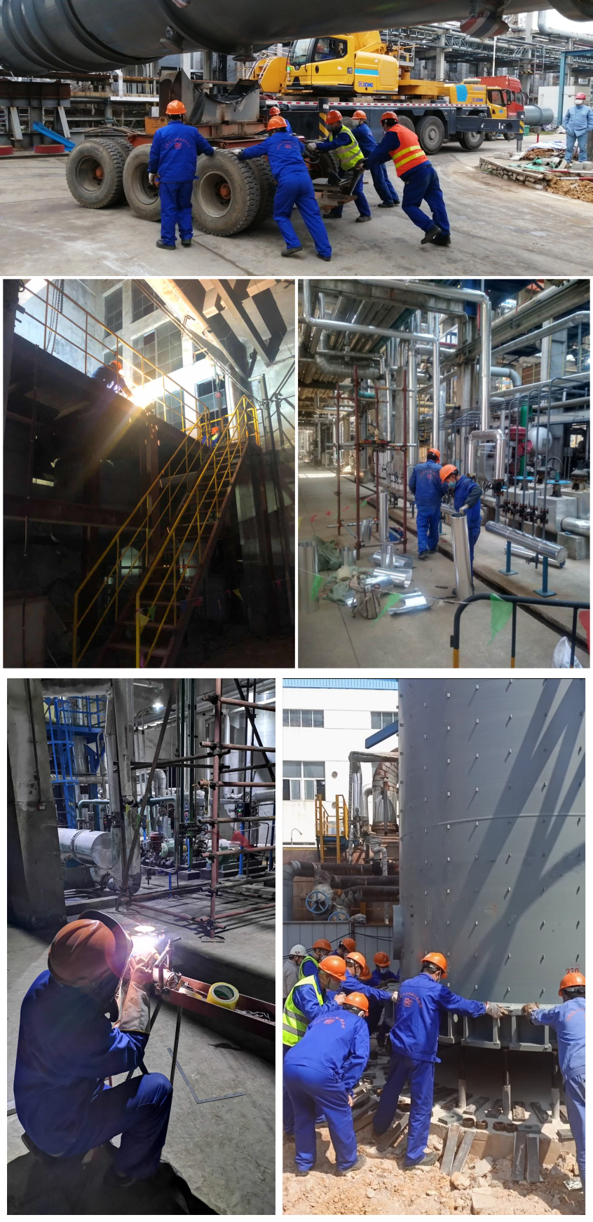 “Ⅰ、Ⅱ硫磺回收裝置增設煙氣后堿洗流程項目”是能使煙氣SO2排放濃度從原先的50mg/m3下降至≤10mg/m3的環保工程。但該項工程僅一個脫硫塔下段就高達33米,重達58噸,體積十分龐大,而現場存在作業場地狹小,固有障礙物多、吊重荷載大等諸多問題,無法將設備一次性運至施工現場并進行下段焊接梯子、平臺等附塔“穿衣戴帽”作業。對此,項目部多次優化倒運方案,提前合理部署,采用額定荷載分別為220噸和90噸的汽車吊實施雙機抬吊作業和專為公路橋梁設計使用的炮車運輸,從而順利完成了倒運工作。同時,為爭取時間,安排班組實行夜間倒班制,管理人員輪班制,為接下來的脫硫塔“穿衣戴帽”和上下段空中組對焊接作業爭取了寶貴時間。