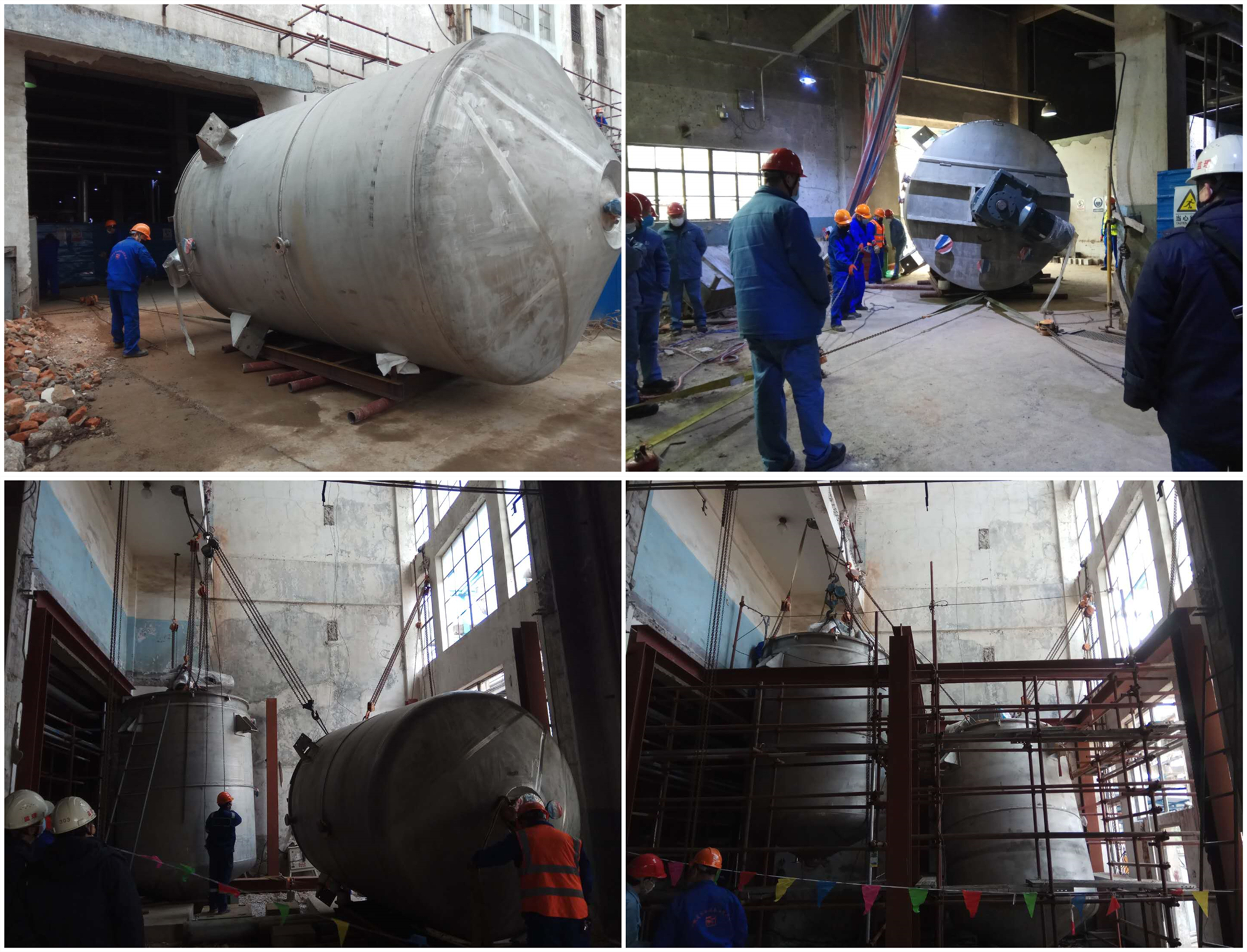 “腈綸阻燃纖維生產技術改造項目”的建成能夠使纖維產品起到防火阻燃的作用,創造更大經濟效益,該項目屬于安慶石化重點項目。項目在施工過程中,由于安裝場地位于室內,運輸和起重機械無法使用,導致2臺12噸、2臺8噸的配料罐無法簡便運輸和吊裝進入室內安裝,給施工人員造成極大的困擾。但方法總比困難多,經項目部拿出具體施工方案與業主、監理研究決定,利用最原始的滾杠搬運辦法,再以原有房梁為吊點,采用2個20噸手動葫蘆吊裝、拉運的方式順利將設備安裝就位。同時項目部合理安排人員加班加點,為后期機泵安裝及工藝管道、鋼結構、電氣儀表、防腐保溫等配套設施施工爭分奪秒,力爭3月31日完成共混單元所有施工,為業主平穩生產產品,創造效益打下堅實基礎,也為安徽安裝的發展打下良好的口碑。