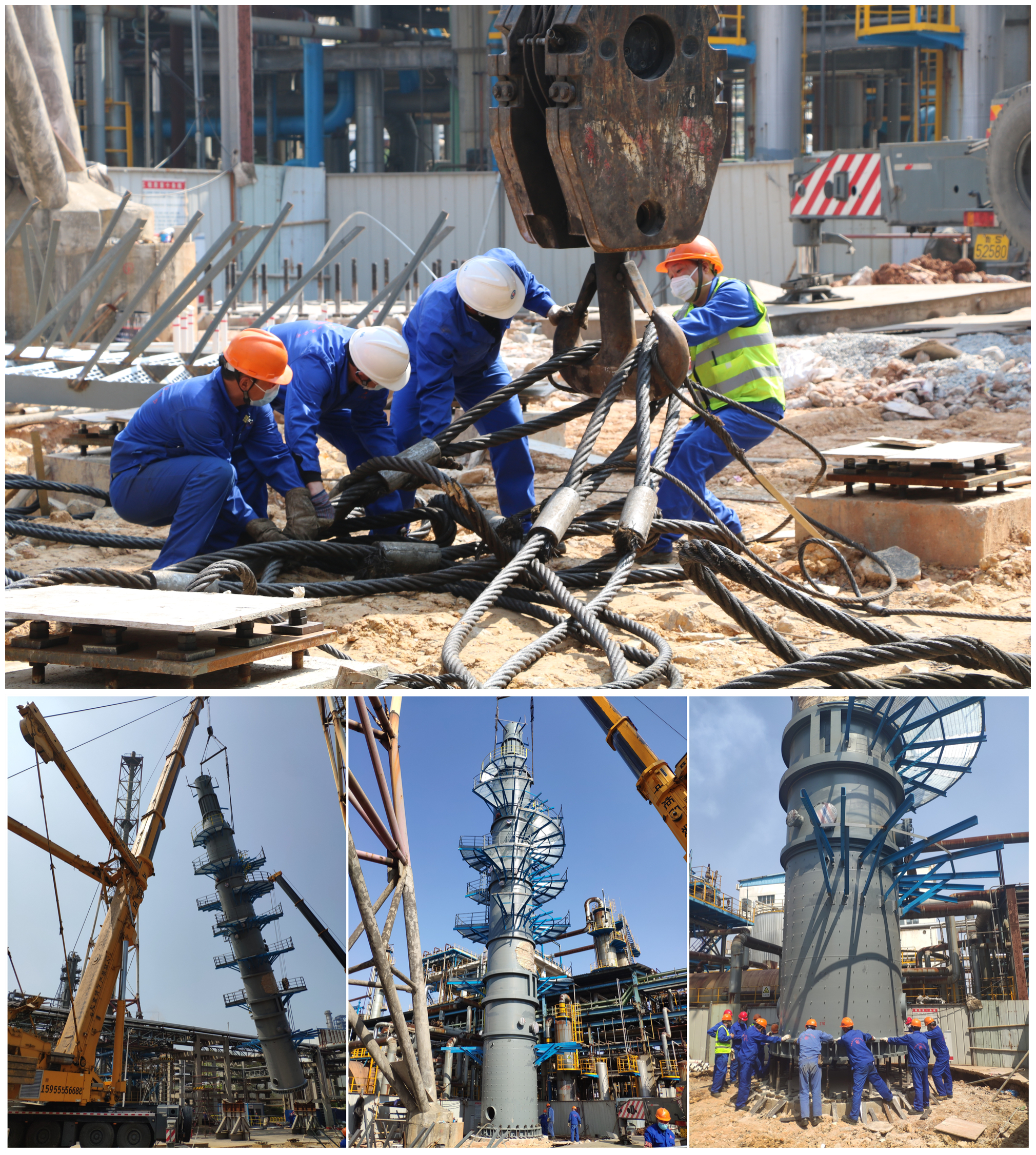 此次吊裝的脫硫塔下段,高33米,直徑3.043米,塔體及設備平臺、爬梯等附塔物總重達76噸。由于作業(yè)場地面積有限、周邊構筑物障礙多、吊重荷載大等諸多困難,吊裝任務異常艱巨。對此,安慶分公司領導高度重視,提前謀劃,從地基處理、吊車站位、吊點選擇等角度,實地考察,制定針對性專項吊裝方案及防護措施,按照方案要求采用額定荷載500噸的汽車吊主吊,220噸的汽車吊溜索,實施雙機配合吊裝作業(yè)。吊裝前期,還特別邀請公司副總經(jīng)理高飛和相關部門負責人親臨項目現(xiàn)場進行指導。