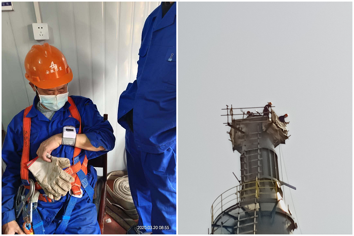面對Ⅲ級高空作業,項目部從對登塔作業人員的篩選開始就不敢有半點大意,除了項目技術負責人、安全負責人分別進行技術和安全交底外,還仔細檢查了登塔人員體檢報告,并在登塔作業前逐一對其進行血壓測量,確保高處作業人員身體狀況穩定。同時,配備對講機,保障上下作業人員密切配合,順利吊裝,還要對作業平臺和周圍區域滿鋪防火布,設置接火盆,避免塔體下方易燃易爆風險,以此杜微慎防,確保萬無一失。11時28分,脫硫塔上段吊裝正式開始。在場人員個個屏息凝神,目光隨著脫硫塔一起移動,思緒跟著脫硫塔一起飆高,“慢慢的...升一點...往西偏一點點...好!停!...降,慢一點...降降降,好!”終于完成上段吊裝環節作業,所有人懸著的心都放下來了,但是任務還沒徹底完成,接下來就是更重要的對口、焊接環節。由于要進入塔內進行對口焊接,為了保障作業人員的生命安全,配備氣體檢測儀,以測量塔內氧氣濃度是否正常,無硫化氫和可燃性氣體是否超標。