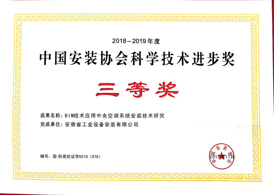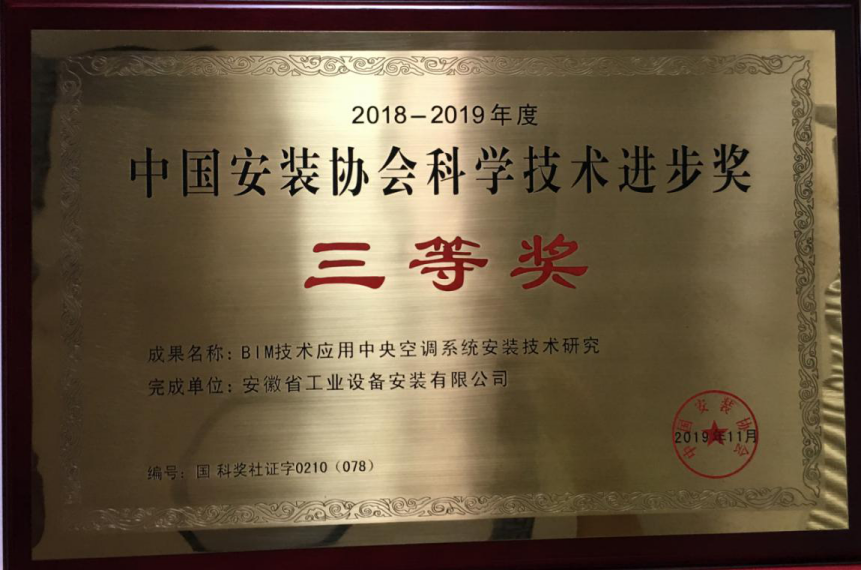 由安徽安裝公司主持研究的《BIM技術應用中央空調系統安裝技術研究》項目榮獲“2018-2019中國安裝協會科學技術進步獎”三等獎榮譽。受疫情影響,該獎牌及證書于8月15日下發。