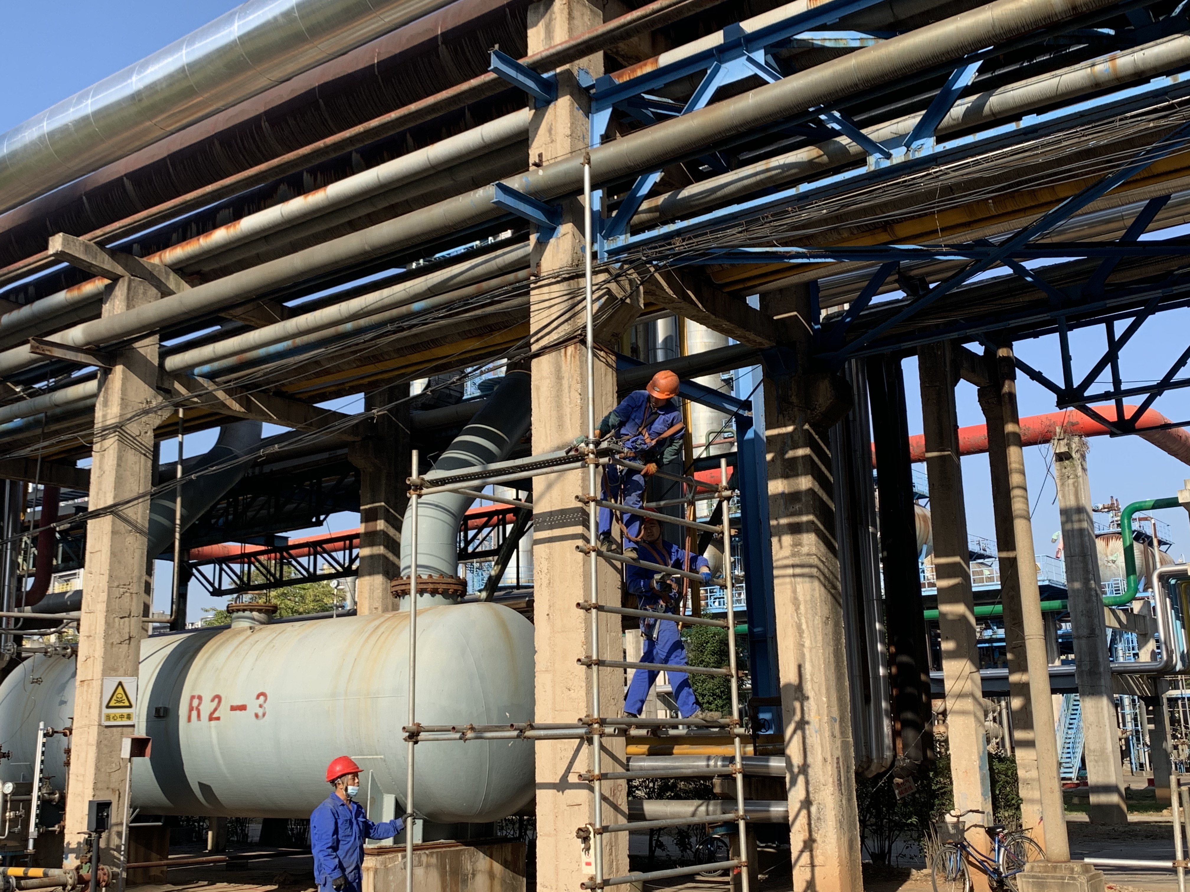 安慶石化低二腈線隱患處理項目在茅青路液化氣罐路口低Ⅱ線分支起至腈綸西圍墻內界區,對原有管道拆除換新。目前施工各項工作均已完成并驗收,相關作業物資已經清理完畢,做好拆除腳手架前的各項準備,按自上而下先裝者后拆,后裝者先拆,逐步拆除,一步一清。