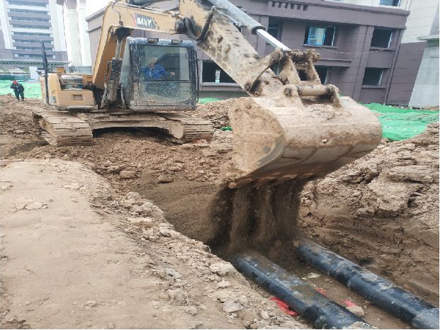 漢城源筑書香苑供暖工程項目部位于江蘇省徐州市沛縣漢城源筑項目書香苑小區,施工范圍包括:書香苑熱力環網(一次環網、二次環網)、熱交換站及自動化控制系統(含PLC全套自控系統)、管道連接、所有與市政及單體樓棟對接檢修井等圖紙范圍內全部內容,以及與紅線外市政管網連接等;合同價1015.37萬元。2020年8月25日正式進場施工后,項目團隊嚴格按照合同施工節點抓生產、保任務,尤其是10月-11月初,全體參建人員不畏艱難、逆勢而上,堅持白加黑、5+2的連續作戰模式,管理人員靠前指揮、作業人員并聯推進,只見挖掘機迅速掘進、土方車來回穿梭、焊接火花四處飛濺……到處一片大干快干的繁忙景象。截至11月10日,第一階段1、2號樓室外熱力管網敷設任務已基本完成,比合同規定節點提前20天,獲得了業主單位的肯定與贊許。