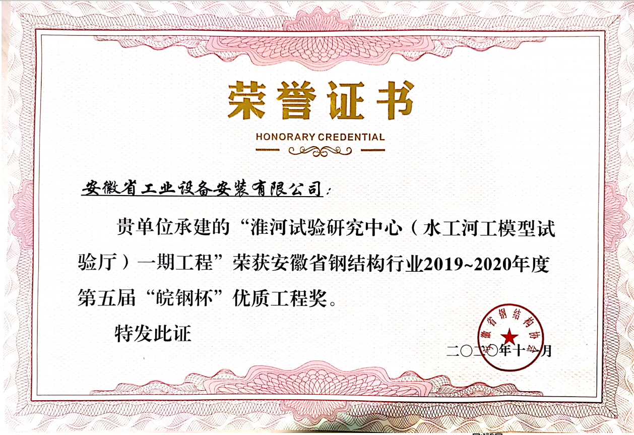 近日,以“聚焦十四五,展望鋼結構”為主題的安徽省鋼結構協會三屆二次會員代表大會暨學術交流會公布了“皖鋼杯”獲獎名單,安徽安裝公司承建的淮河試驗研究中心(水工河工模型試驗廳)一期工程榮獲“皖鋼杯”優質工程獎,公司黨委書記、董事長胡六中榮獲安徽省鋼結構行業優秀企業家,蚌埠分公司副經理、淮河試驗研究中心一期工程項目經理張斌被評為優秀項目經理。這也是我公司首次榮獲鋼結構工程類獎項。