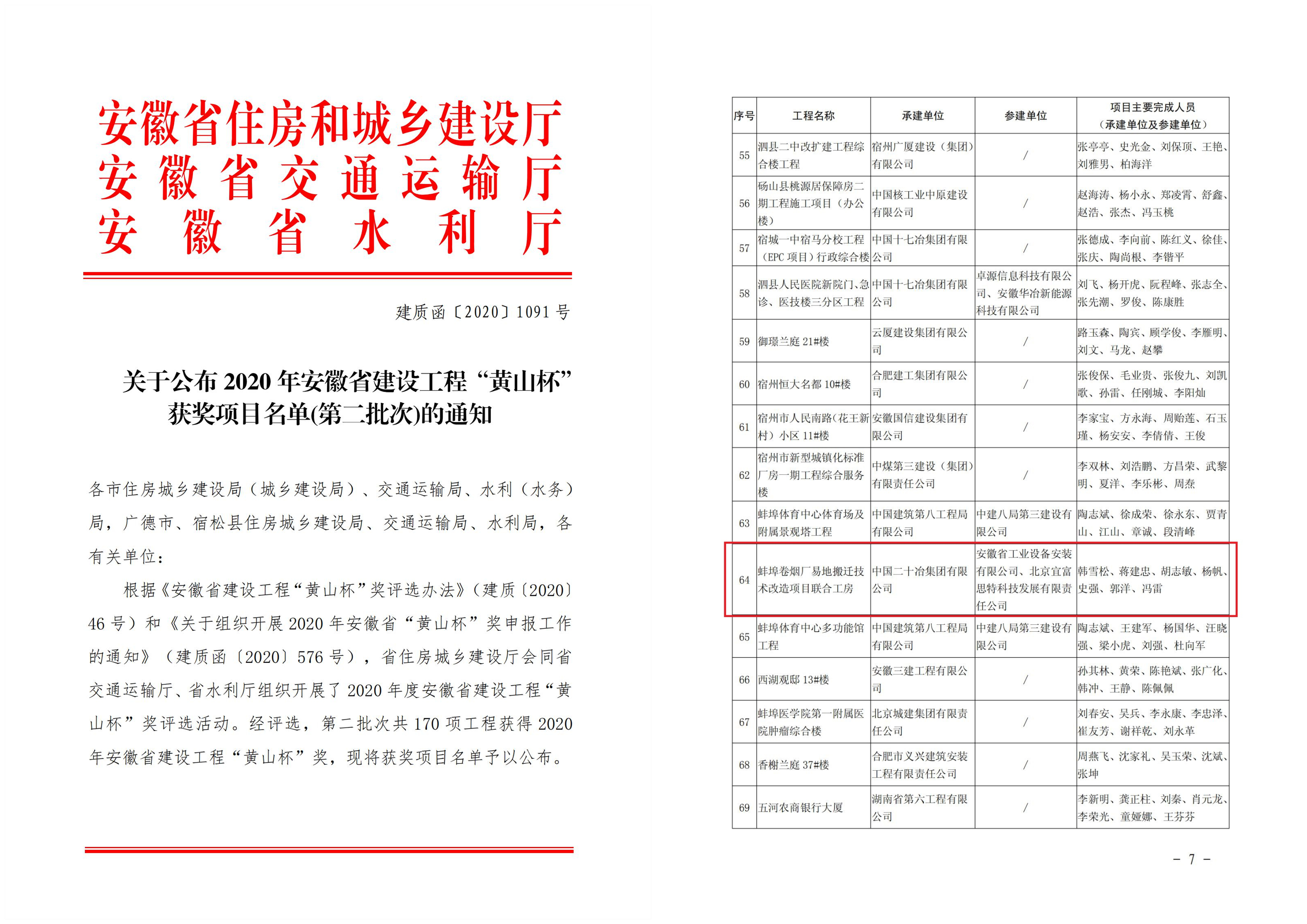 12月14日,經(jīng)安徽省住房城鄉(xiāng)建設(shè)廳會(huì)同省交通運(yùn)輸廳、省水利廳評(píng)選,安徽安裝公司蚌埠卷煙廠易地搬遷技術(shù)改造項(xiàng)目聯(lián)合工房等機(jī)電安裝工程榮獲“黃山杯”獎(jiǎng)。