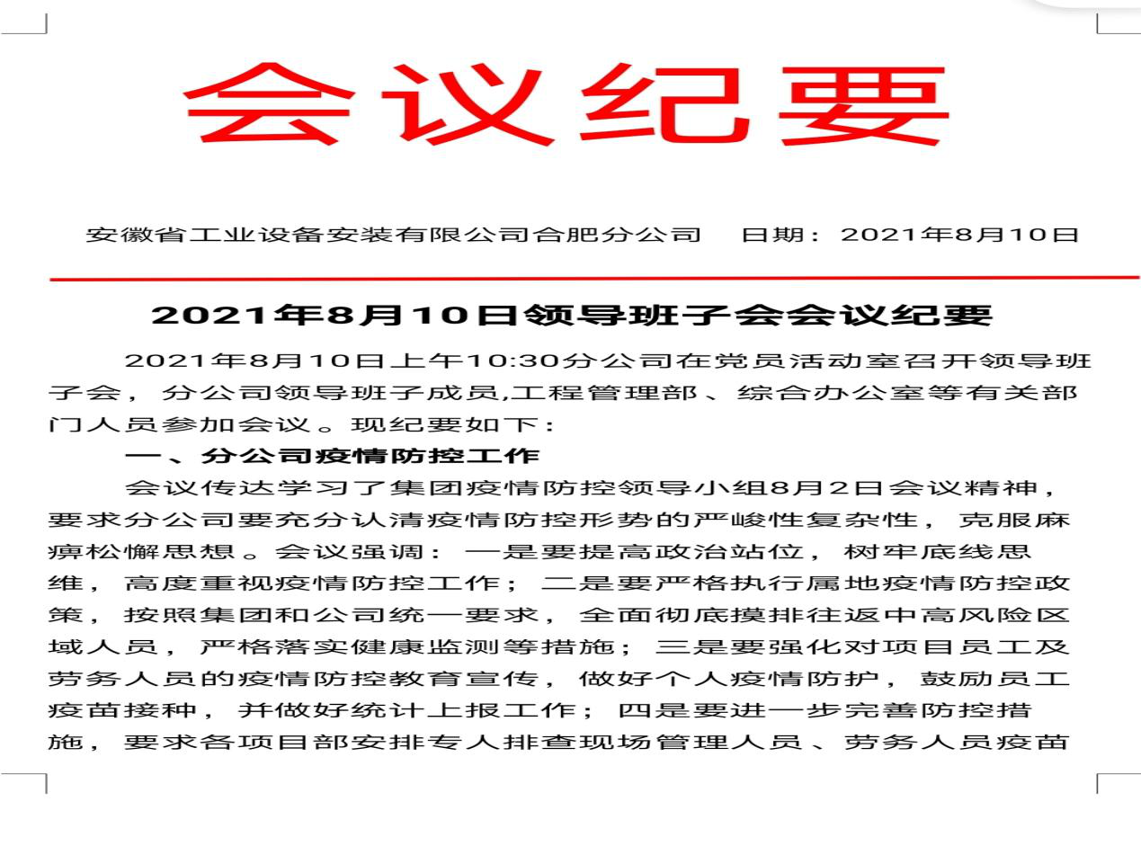 分公司所屬在建項目部也在積極推進疫情防控各項工作,靈璧項目部召開疫情防控部署會議,專題部署項目開展疫情防控工作;新宇藥業項目積極響應宿州市政府及公司相關防疫要求,成立項目部疫情防控領導小組,設立防疫檢測點和隔離室,對每日進出場地人員進行體溫登記和安康碼及行程監測。