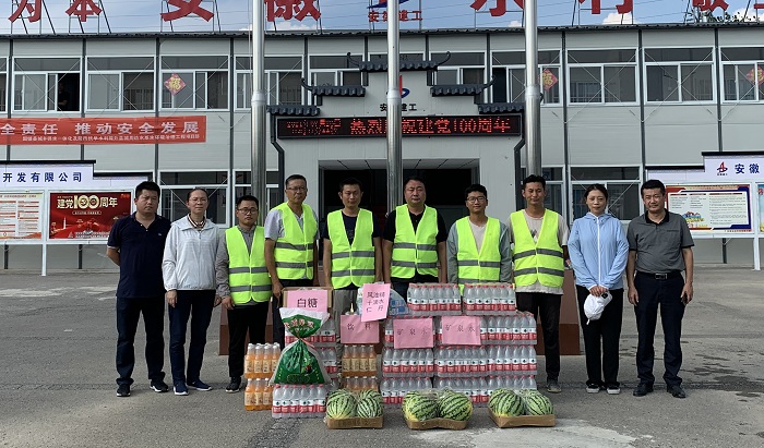 為做好高溫天氣下項(xiàng)目施工防暑降溫工作,切實(shí)保障項(xiàng)目一線(xiàn)職工的安全健康,確保安全生產(chǎn)工作順利展開(kāi),7月15日以來(lái)合肥分公司領(lǐng)導(dǎo)班子成員分別前往宿州新宇藥業(yè)、靈璧迎賓大道、固鎮(zhèn)三八河景觀(guān)工程、潛山高鐵站前廣場(chǎng)等各在建項(xiàng)目現(xiàn)場(chǎng),開(kāi)展夏日“送清涼”慰問(wèn)活動(dòng),為現(xiàn)場(chǎng)一線(xiàn)工作人員送去防暑降溫慰問(wèn)物資,并對(duì)酷暑天氣仍然堅(jiān)守在一線(xiàn)施工作業(yè)人員表示親切的關(guān)心和問(wèn)候。
