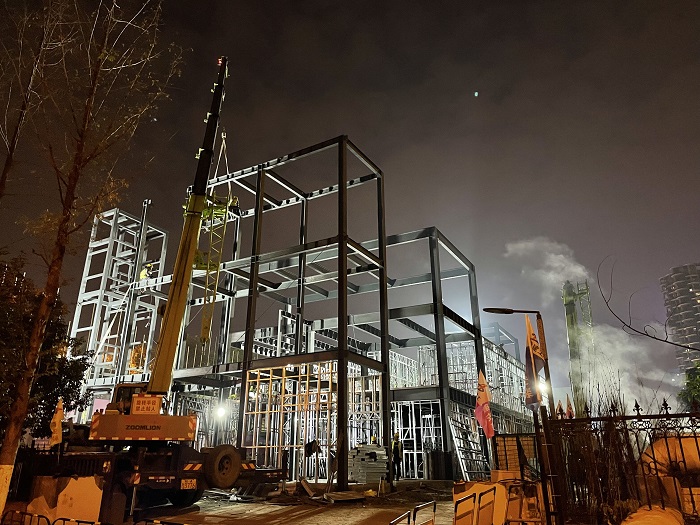 為搶抓工期,項目部迅速調集人力,自開工以來,項目一線施工人員一直保持在150人左右,采取24小時輪班制度,兩班倒的方式,“人歇工地不停”,在嚴格實施安全防疫的同時加班加點搶時間,趕任務,確保項目現場施工不斷推進,即使是在不利于施工作業的雨天,大家也合理安排施工計劃,主動放棄休息,在已經封頂的一層、二層結構中進行水、電、通風、內部裝飾等工作,全力以赴加快項目建設進度。