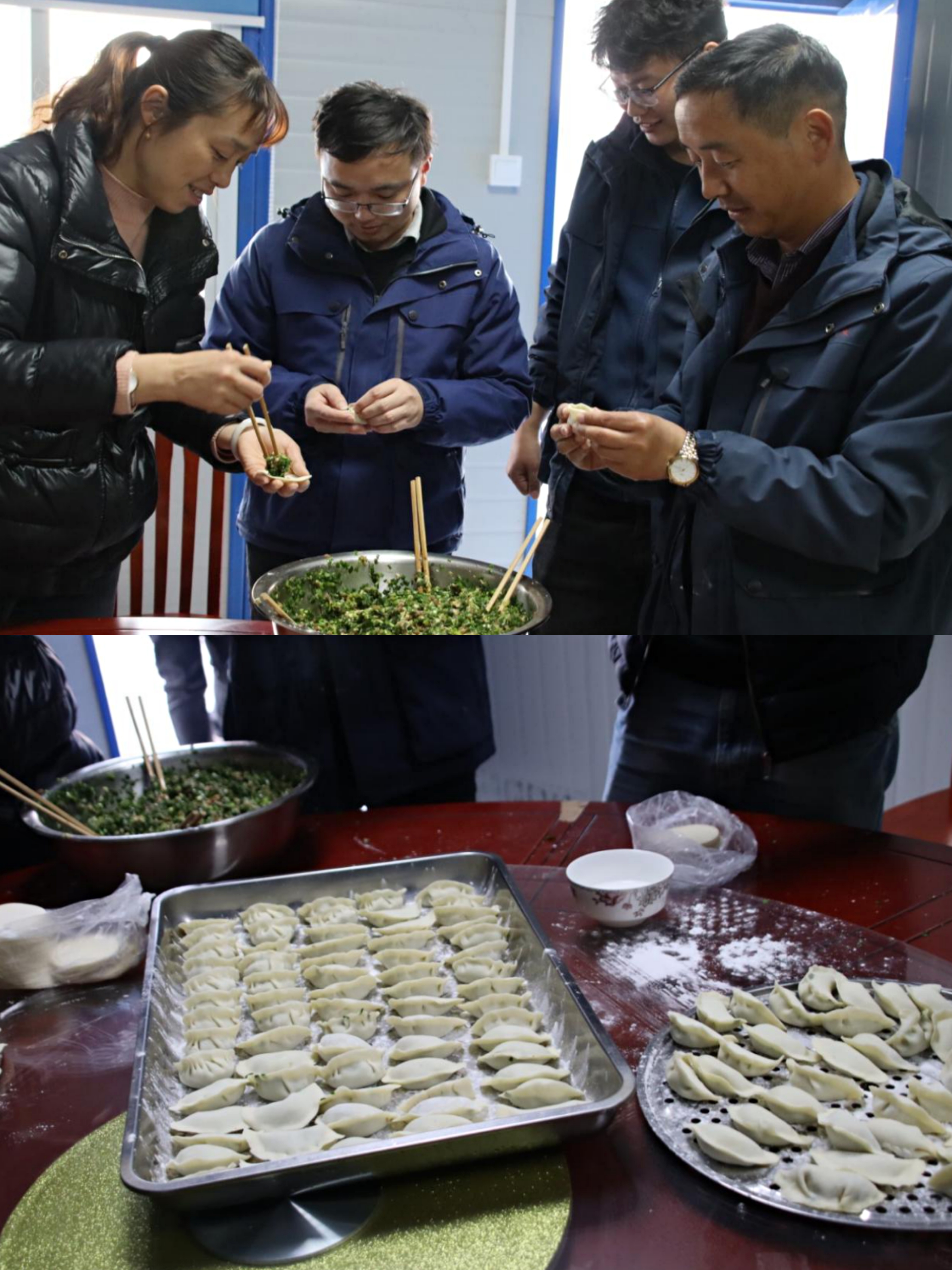 在整個包餃子過程中,大家熱情高漲,積極參與,分享經(jīng)驗,不一會兒,一排排餃子就成型了,有的用料十足,包出的餃子個大肚圓;有的用料較少,包出的餃子小巧美觀。元寶餃子、月牙餃子、麥穗餃子……項目部到處洋溢歡聲笑語,彌漫著“家”的味道、“家”的溫馨。
