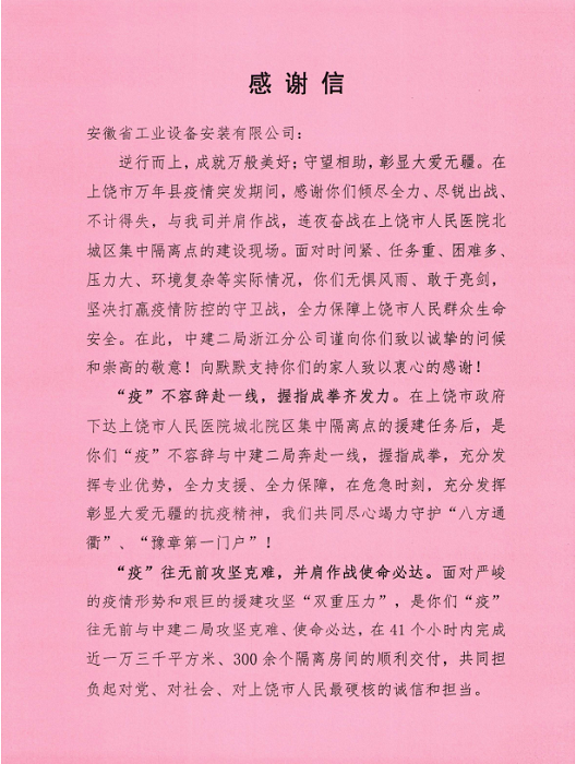 近日,安徽安裝公司收到來(lái)自中共中建二局浙江分公司委員會(huì)的一封感謝信,這是安徽安裝公司參加援建項(xiàng)目以來(lái)收到的第2封感謝信。