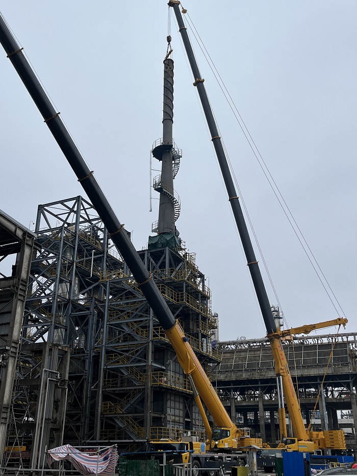 該項目原有煙囪吊耳主軸低于規范要求,存在安全隱患,因此在本次檢修期間重新制作并利用吊籠在高空焊接安裝吊耳。該煙囪及附件整體重約50噸,設備位于25米框架頂,煙囪長35米,煙囪頂部距地面60米,受施工空間影響,采用動態施工的組織方法,利用500T吊車主吊與130T吊車溜尾、高空組對焊接及分段吊裝等技術確保該煙囪順利吊裝。