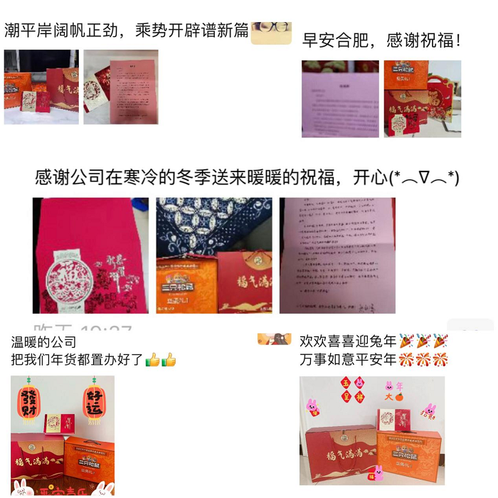 為了表達對分公司全體員工一年來辛勤工作的感謝之情和最誠摯的新春問候,分公司從細節(jié)著手,從點滴做起,通過新春送溫暖活動,傳遞對廣大員工的關(guān)心和慰問。春節(jié)前,分公司特別為大家送去了飽含深情的《感謝信》和新年大禮包,將美好的祝福送到了每位員工的心坎里。同時還為新入職員工送去了《歡迎辭》,表達了分公司求賢若渴的殷殷期待,并希望他們能立足崗位,踏實工作,為企業(yè)高質(zhì)量發(fā)展奉獻青春和力量,書寫屬于自己的絢麗華章。