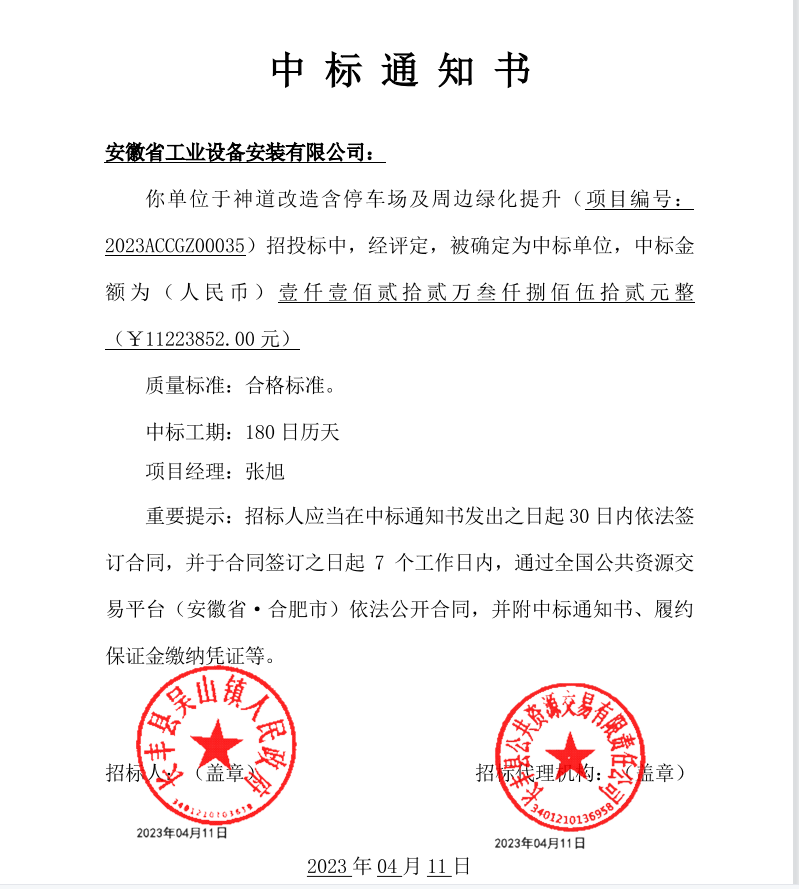 4月11日,安徽安裝市政分公司在合肥市公共資源交易平臺(tái)上投標(biāo)長(zhǎng)豐縣吳山鎮(zhèn)神道改造含停車場(chǎng)及周邊綠化提升項(xiàng)目并一舉中標(biāo),中標(biāo)金額1122.38萬(wàn)元。這次公招中標(biāo)是分公司繼2022年8月12日廬江立人路項(xiàng)目中標(biāo)后第二次在合肥市公招市場(chǎng)中標(biāo)的市政類項(xiàng)目。