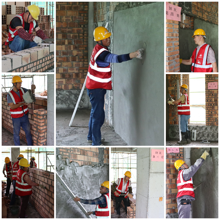 隨著分公司經(jīng)理、黨支部副書記許杰熱情洋溢的動員講話,比賽正式拉開序幕。比賽中,選手們各顯神通,挑磚、測量、切割、砌筑、勾縫、找平、清理、抹灰等工序有條不紊,全力使自己的“作品”立面垂直、陰陽角方正、表面平整、線條順直、砂漿收水、基層濕潤。
