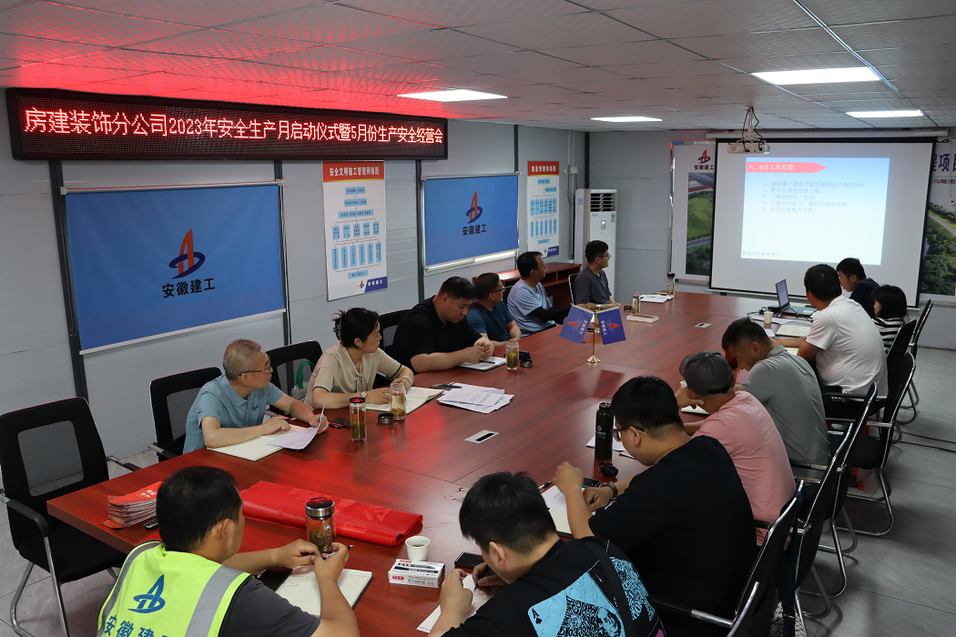 5月31日上午,房建(裝飾)分公司在阜南污水廠項目會議室召開5月份生產安全經營會。分公司領導班子成員、各部門負責人、項目經理及項目員工共20余人參加會議。會議由分公司副經理王岳濤主持。
