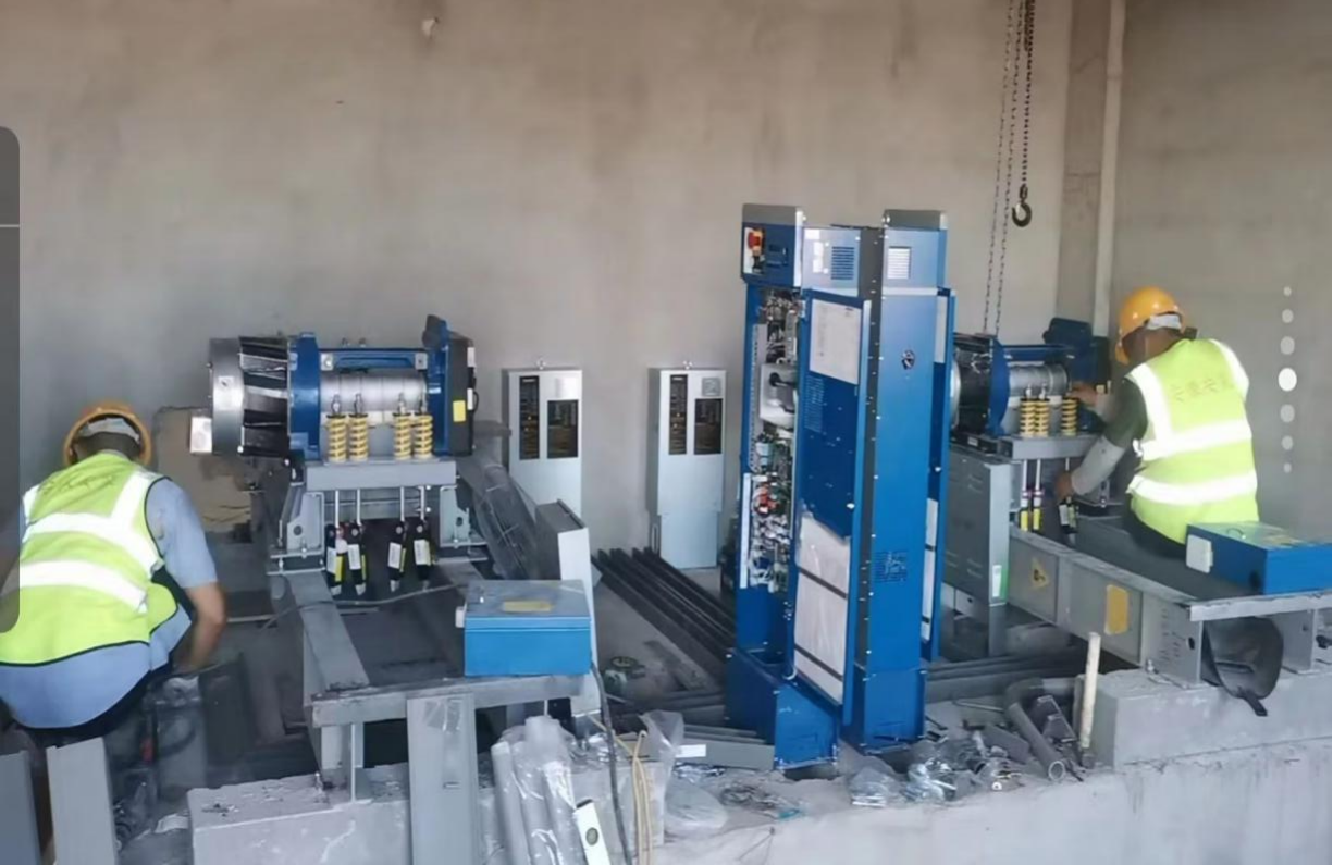 桃花科創(chuàng)產(chǎn)業(yè)園EPC總承包電梯安裝工程施工人員正在安裝電梯曳引機(jī)