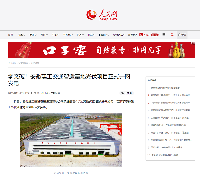 【名媒聚焦】人民網:零突破!安徽建工交通智造基地光伏項目正式并網發電