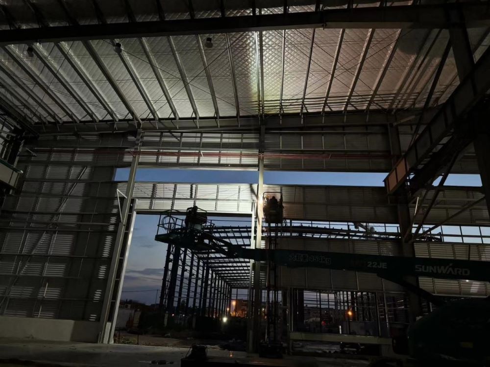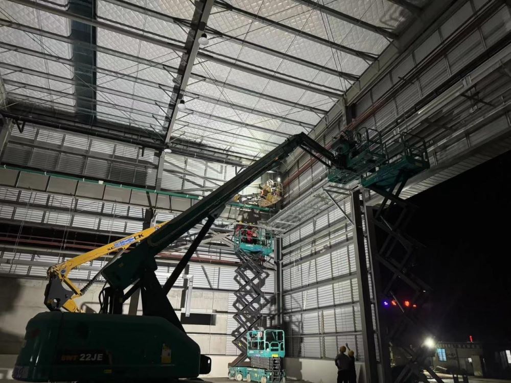 建工安裝合肥分公司施工內容涉及2#重鋼車間主次構安裝、圍護系統、門窗、防火涂料、通風氣樓和機電安裝工程(裝飾裝修、工藝管線、消防、給排水、電氣、通風空調等)。為保質保量完成施工任務,分公司派駐分管領導現場駐點,項目管理團隊日夜跟進,施工人數達到100多人,曲臂車、登高車等各種現場施工機械達60余輛。本項目留給機電安裝工期緊任務重,項目全體人員日夜奮戰,最終刷新15日大面完工耀眼戰績,為基地順利投產奠定堅實基礎。