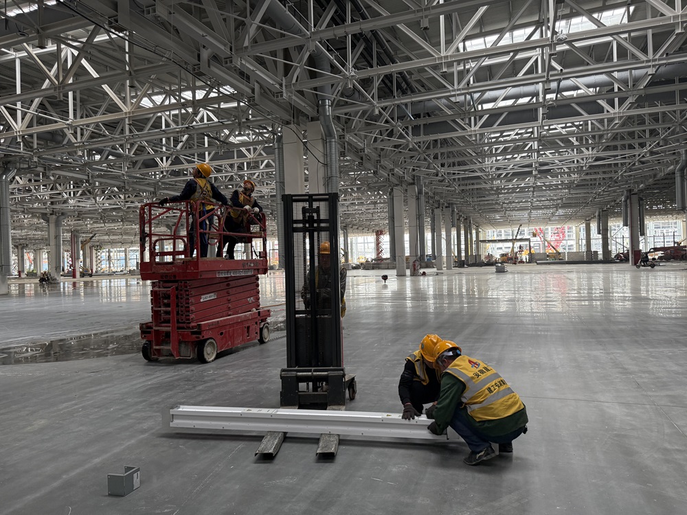 截至目前,焊裝車間燈具、車間一東側630毫米循環水不銹鋼管已全部安裝完成。本周完成消防箱安裝150套,母線安裝700米,屋頂風機設備吊裝到位,如期完成節點目標。與此同時,工藝廠家已進場同步施工。