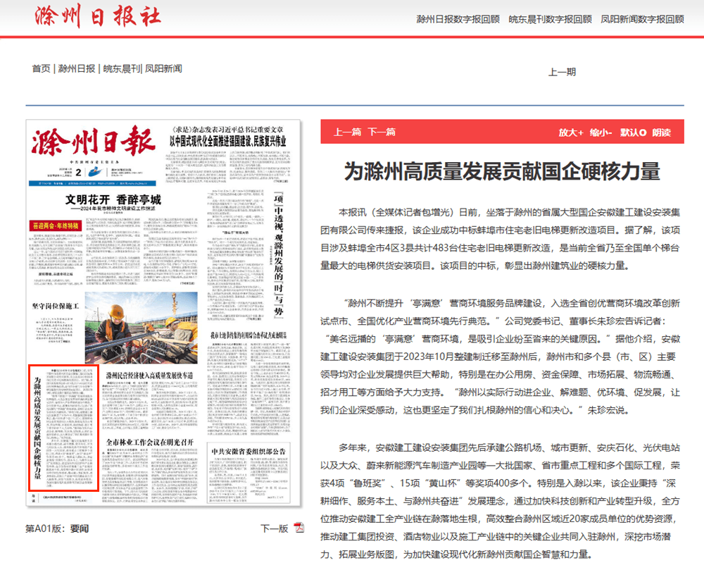 【名媒聚焦】滁州日報頭版報道安徽建工建設安裝集團有限公司
