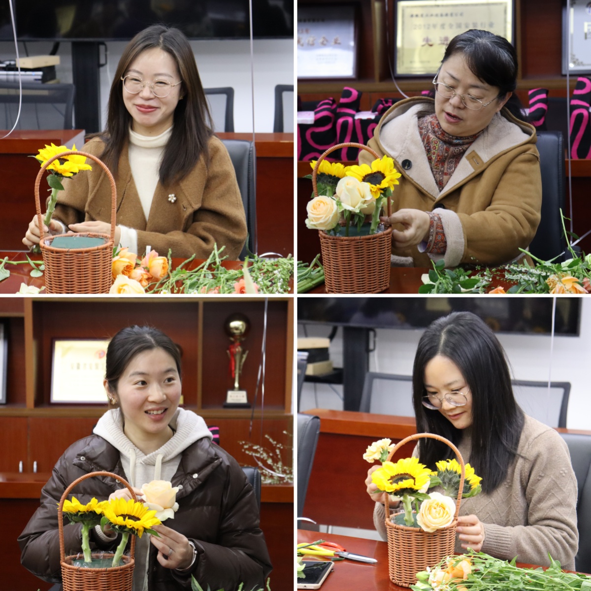 活動現場花香四溢,充滿著春天的氣息,專業花藝師從花材特性、色彩美學到造型構思向大家進行了系統講解并進行了現場演示。女職工們興致盎然、躍躍欲試,充分發揮自己的想象力,以高漲的熱情投入到插花創作中,紛紛化身“春日設計師”,將玫瑰的熱烈、百合的芬芳、向日葵的陽光巧妙組合,在修剪與構思中展現女性的細膩匠心。大家一邊插花創作,一邊互相交流著自己的想法和創意,現場充滿了歡聲笑語、其樂融融。