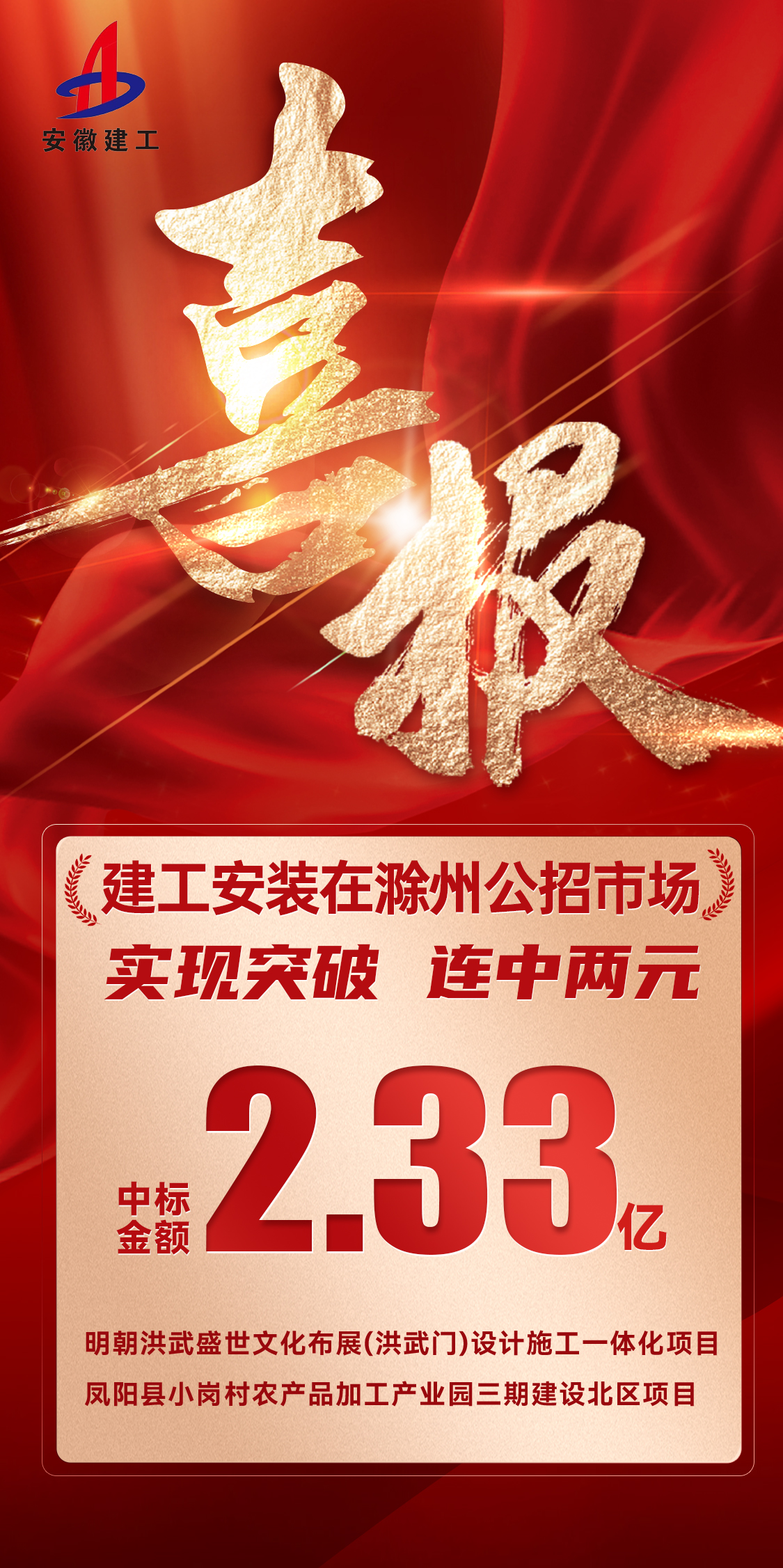 喜報!建工安裝滁州區域連中兩元