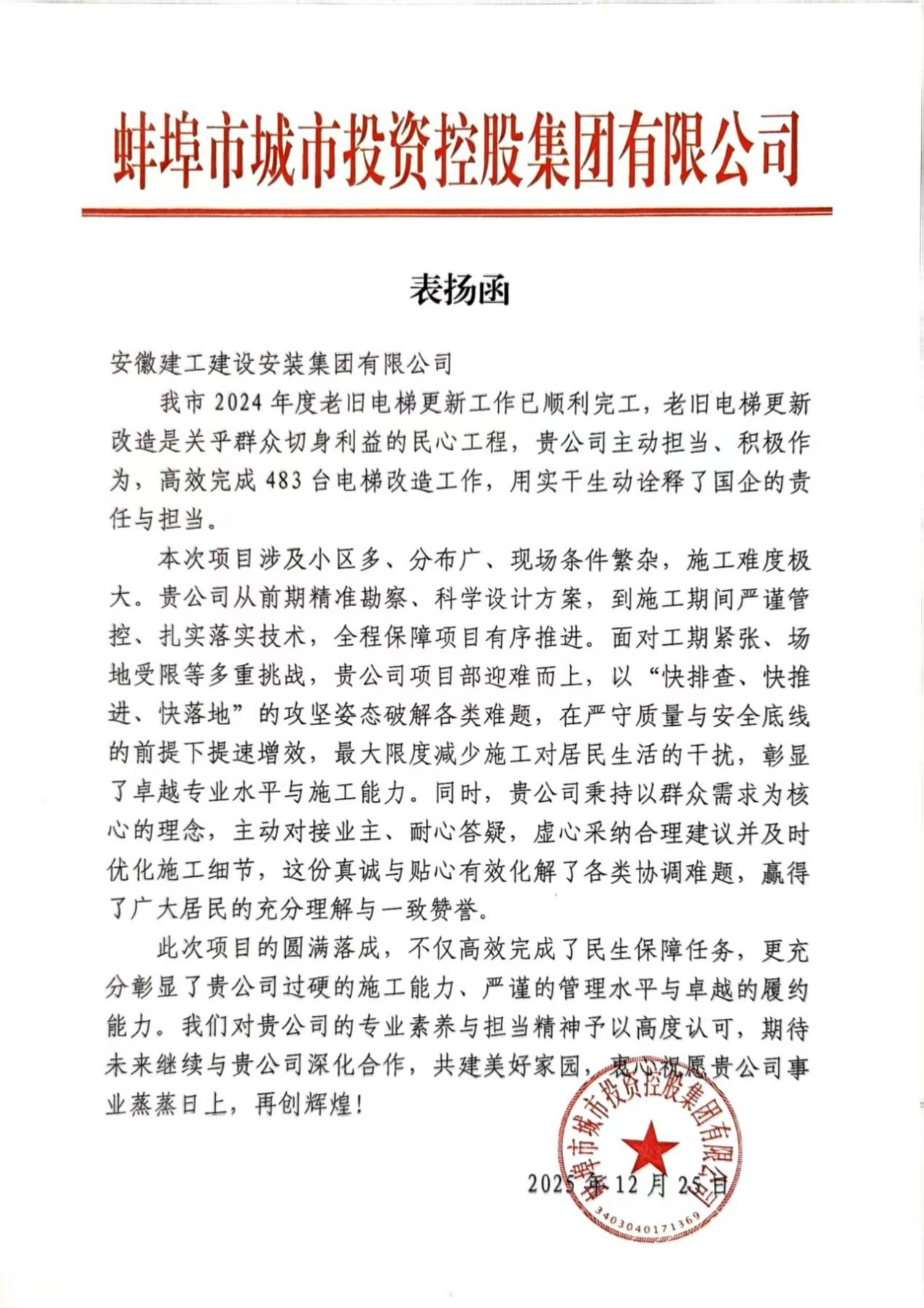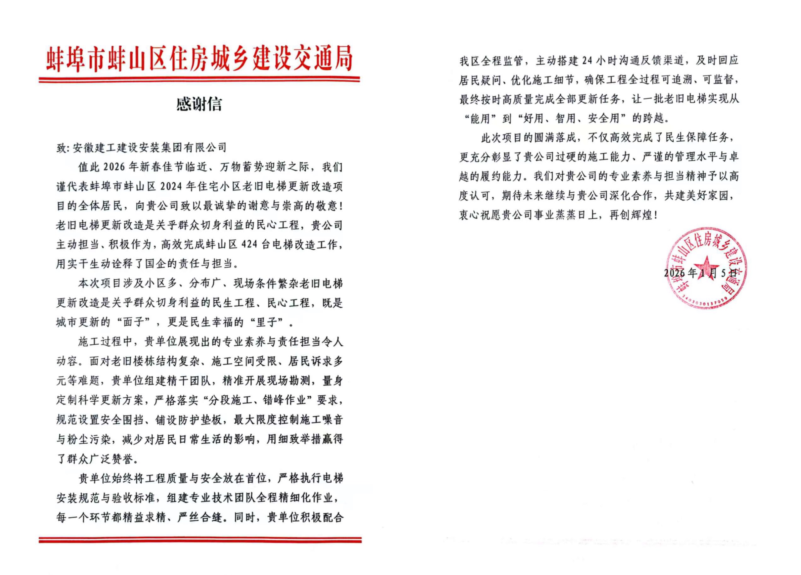 歲末年初,建工安裝接連收到來自六安市金安區住房和城鄉建設局、蚌埠市蚌山區住房城鄉建設交通局、蚌埠市城市投資控股集團有限公司的感謝信與表揚函。各方紛紛對公司2025年以來在省內多地老舊電梯更新改造項目中展現的卓越履約能力、強烈責任擔當和過硬專業素養水平給予高度評價,字里行間滿含贊譽肯定與誠摯謝意。